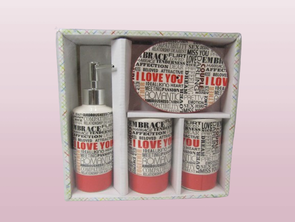 Set de baie din ceramică ce conține :două suporturi pentru periuțe și pastă de dinți,săpunieră,sticlă pentru săpun lichid.